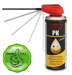 Dầu bôi trơn tẩy rỉ sét PK là dạng chai xịt 400ml được nhập khẩu trực tiếp từ Ý (www.siliconi.it) với chất lượng dầu bôi trơn cao nên bảo vệ rỉ sét rất tốt cho kim loại và chất tẩy rửa rỉ sét nhanh nên thường được ứng dụng trong công nghiệp bảo dưỡng (xe đạp, xe máy và phụ tùng xe), giảm ma sát trong cơ khí (chuyển động), các bu lông đai ốc, thiết bị điện (tách ẩm và loại bỏ hơi nước trong thiết bị điện). Xuất xứ: Italy.
